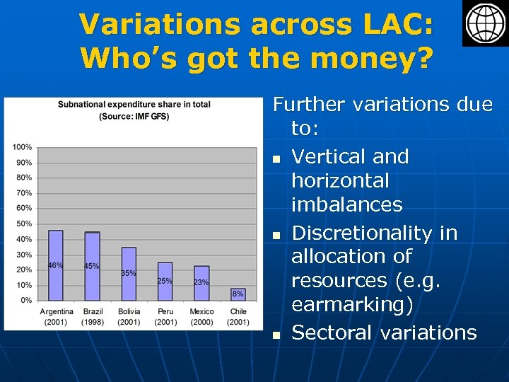 Variations across LAC: Who’s got the money? Further variations due to: n Vertical and horizontal imbalances n Discretionality in allocation of resources (e. g. earmarking) n Sectoral variations