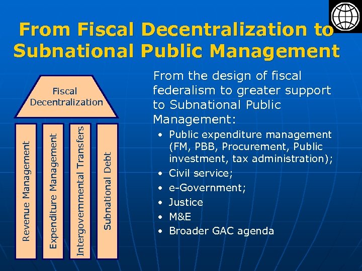 From Fiscal Decentralization to Subnational Public Management Subnational Debt Intergovernmental Transfers Expenditure Management Revenue Management Fiscal Decentralization From the design of fiscal federalism to greater support to Subnational Public Management: • Public expenditure management (FM, PBB, Procurement, Public investment, tax administration); • Civil service; • e-Government; • Justice • M&E • Broader GAC agenda