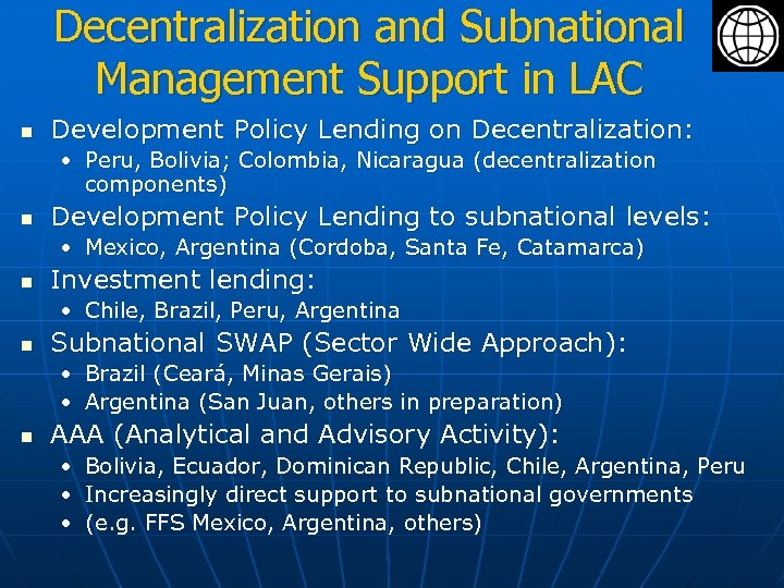 Decentralization and Subnational Management Support in LAC n Development Policy Lending on Decentralization: • Peru, Bolivia; Colombia, Nicaragua (decentralization components) n Development Policy Lending to subnational levels: • Mexico, Argentina (Cordoba, Santa Fe, Catamarca) n Investment lending: • Chile, Brazil, Peru, Argentina n Subnational SWAP (Sector Wide Approach): • Brazil (Ceará, Minas Gerais) • Argentina (San Juan, others in preparation) n AAA (Analytical and Advisory Activity): • • • Bolivia, Ecuador, Dominican Republic, Chile, Argentina, Peru Increasingly direct support to subnational governments (e. g. FFS Mexico, Argentina, others)