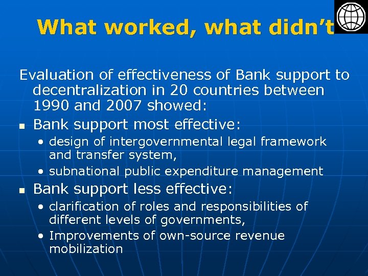 What worked, what didn’t Evaluation of effectiveness of Bank support to decentralization in 20 countries between 1990 and 2007 showed: n Bank support most effective: • design of intergovernmental legal framework and transfer system, • subnational public expenditure management n Bank support less effective: • clarification of roles and responsibilities of different levels of governments, • Improvements of own-source revenue mobilization