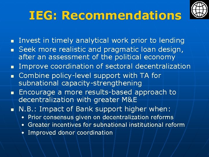 IEG: Recommendations n n n Invest in timely analytical work prior to lending Seek more realistic and pragmatic loan design, after an assessment of the political economy Improve coordination of sectoral decentralization Combine policy-level support with TA for subnational capacity-strengthening Encourage a more results-based approach to decentralization with greater M&E N. B. : Impact of Bank support higher when: • Prior consensus given on decentralization reforms • Greater incentives for subnational institutional reform • Improved donor coordination