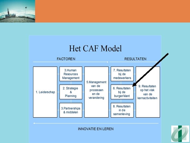 CAF geëvalueerd • Zwaktes • Complexe oefening die betrokkenheid vereist van diverse verantwoordelijken (werkbelasting, externe ondersteuning, voorzien van vorming) • • Scoring is (voorlopig) minder rigoureus dan bij EFQM-evaluatie CAF-oefening mag niet het einde zijn van het kwaliteitsbeleid (koppeling aan verbeteringsacties, continue verbetering)