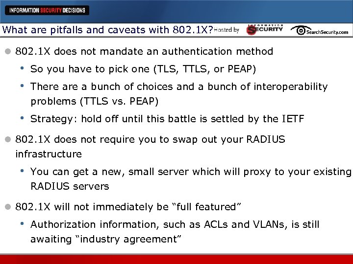 What are pitfalls and caveats with 802. 1 X? l 802. 1 X does not mandate an authentication method • • So you have to pick one (TLS, TTLS, or PEAP) • Strategy: hold off until this battle is settled by the IETF There a bunch of choices and a bunch of interoperability problems (TTLS vs. PEAP) l 802. 1 X does not require you to swap out your RADIUS infrastructure • You can get a new, small server which will proxy to your existing RADIUS servers l 802. 1 X will not immediately be “full featured” • Authorization information, such as ACLs and VLANs, is still awaiting “industry agreement”