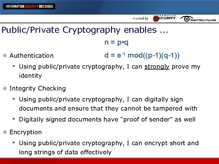 Public/Private Cryptography enables. . . n = p • q l Authentication • d = e-1 mod((p-1)(q-1)) Using public/private cryptography, I can strongly prove my identity l Integrity Checking • Using public/private cryptography, I can digitally sign documents and ensure that they cannot be tampered with • Digitally signed documents have “proof of sender” as well l Encryption • Using public/private cryptography, I can encrypt short and long strings of data effectively