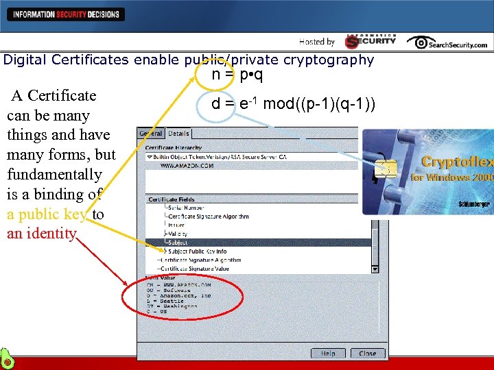 Digital Certificates enable public/private cryptography n = p • q A Certificate can be many things and have many forms, but fundamentally is a binding of a public key to an identity d = e-1 mod((p-1)(q-1))