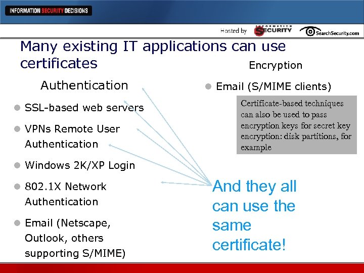 Many existing IT applications can use certificates Encryption Authentication l SSL-based web servers l VPNs Remote User Authentication l Email (S/MIME clients) Certificate-based techniques can also be used to pass encryption keys for secret key encryption: disk partitions, for example l Windows 2 K/XP Login l 802. 1 X Network Authentication l Email (Netscape, Outlook, others supporting S/MIME) And they all can use the same certificate!