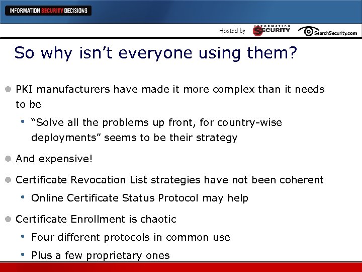 So why isn’t everyone using them? l PKI manufacturers have made it more complex than it needs to be • “Solve all the problems up front, for country-wise deployments” seems to be their strategy l And expensive! l Certificate Revocation List strategies have not been coherent • Online Certificate Status Protocol may help l Certificate Enrollment is chaotic • • Four different protocols in common use Plus a few proprietary ones