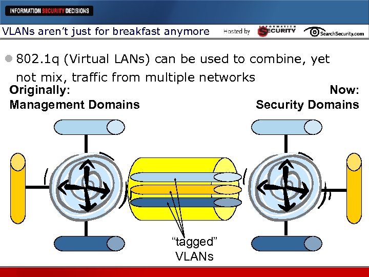 VLANs aren’t just for breakfast anymore l 802. 1 q (Virtual LANs) can be used to combine, yet not mix, traffic from multiple networks Originally: Now: Management Domains Security Domains “tagged” VLANs