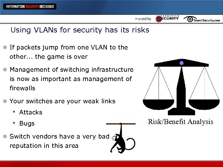 Using VLANs for security has its risks l If packets jump from one VLAN to the other. . . the game is over l Management of switching infrastructure is now as important as management of firewalls l Your switches are your weak links • • Attacks Bugs l Switch vendors have a very bad reputation in this area Risk/Benefit Analysis