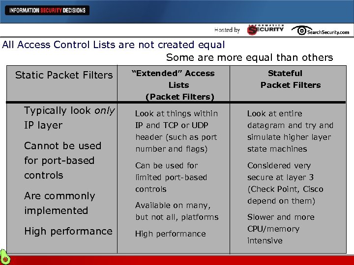 All Access Control Lists are not created equal Some are more equal than others “Extended” Access Lists Static Packet Filters Stateful Packet Filters (Packet Filters) l Typically look only l IP layer l Cannot be used for port-based controls l Are commonly implemented l High performance Look at things within IP and TCP or UDP header (such as port number and flags) l Can be used for limited port-based controls l Available on many, but not all, platforms l High performance l Look at entire datagram and try and simulate higher layer state machines l Considered very secure at layer 3 (Check Point, Cisco depend on them) l Slower and more CPU/memory intensive