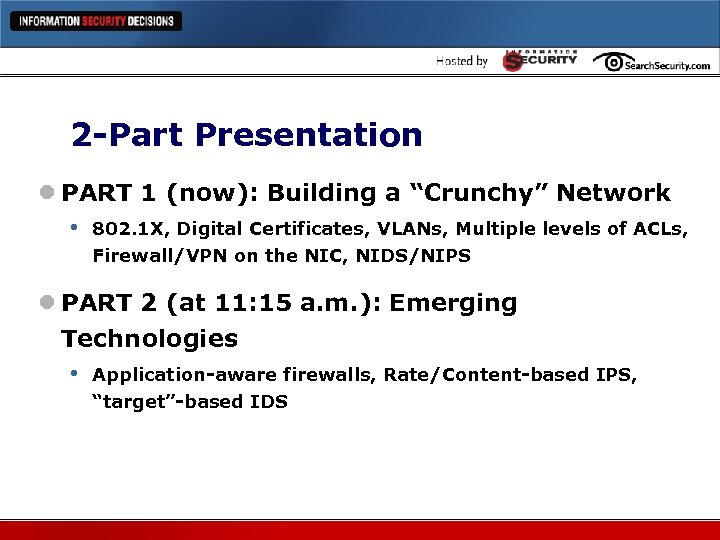 2 -Part Presentation l PART 1 (now): Building a “Crunchy” Network • 802. 1 X, Digital Certificates, VLANs, Multiple levels of ACLs, Firewall/VPN on the NIC, NIDS/NIPS l PART 2 (at 11: 15 a. m. ): Emerging Technologies • Application-aware firewalls, Rate/Content-based IPS, “target”-based IDS
