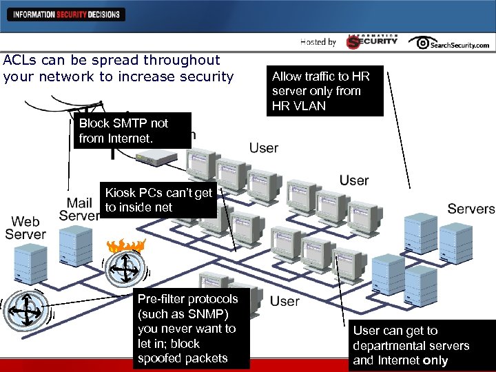ACLs can be spread throughout your network to increase security Allow traffic to HR server only from HR VLAN Block SMTP not from Internet. Kiosk PCs can’t get to inside net Pre-filter protocols (such as SNMP) you never want to let in; block spoofed packets User can get to departmental servers and Internet only