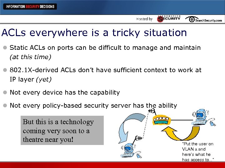ACLs everywhere is a tricky situation l Static ACLs on ports can be difficult to manage and maintain (at this time) l 802. 1 X-derived ACLs don’t have sufficient context to work at IP layer (yet) l Not every device has the capability l Not every policy-based security server has the ability But this is a technology coming very soon to a theatre near you! “Put the user on VLAN x and here’s what he has access to. . . ”