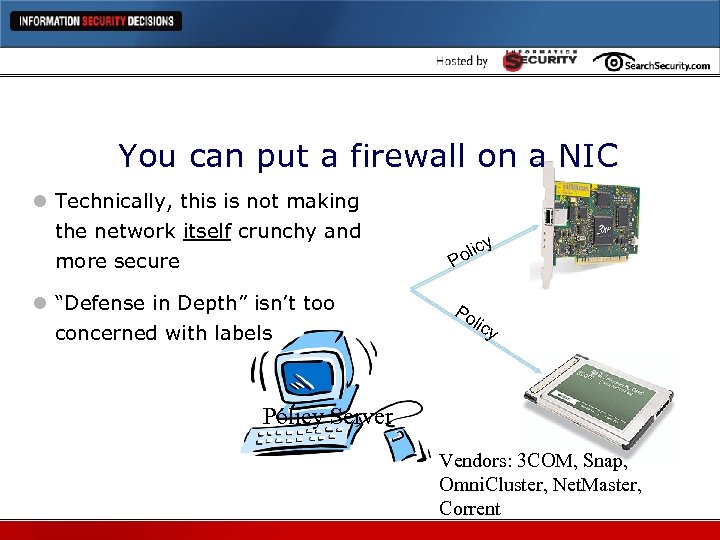 You can put a firewall on a NIC l Technically, this is not making the network itself crunchy and more secure l “Defense in Depth” isn’t too concerned with labels y lic Po Po lic y Policy Server Vendors: 3 COM, Snap, Omni. Cluster, Net. Master, Corrent