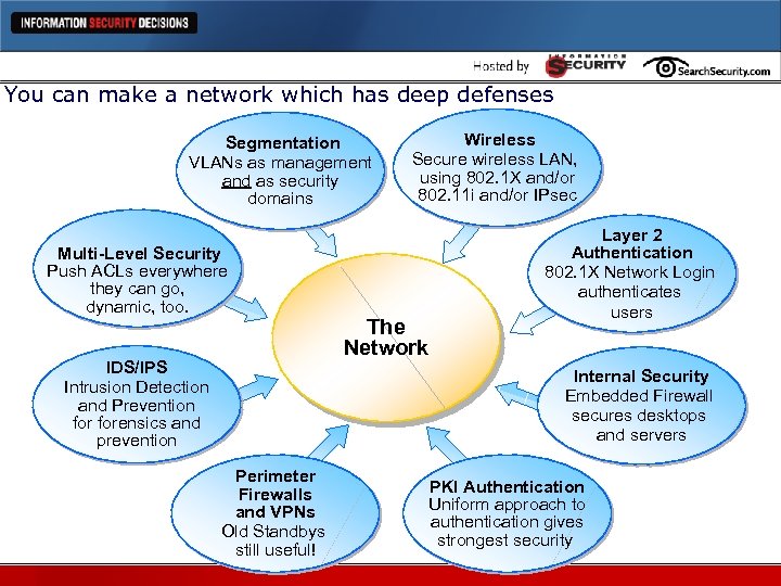 You can make a network which has deep defenses Segmentation VLANs as management and as security domains Multi-Level Security Push ACLs everywhere they can go, dynamic, too. IDS/IPS Intrusion Detection and Prevention forensics and prevention Wireless Secure wireless LAN, using 802. 1 X and/or 802. 11 i and/or IPsec The Network Layer 2 Authentication 802. 1 X Network Login authenticates users Internal Security Embedded Firewall secures desktops and servers Perimeter Firewalls and VPNs Old Standbys still useful! PKI Authentication Uniform approach to authentication gives strongest security