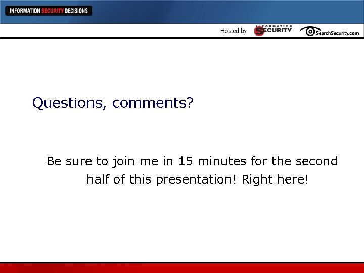 Questions, comments? Be sure to join me in 15 minutes for the second half of this presentation! Right here!