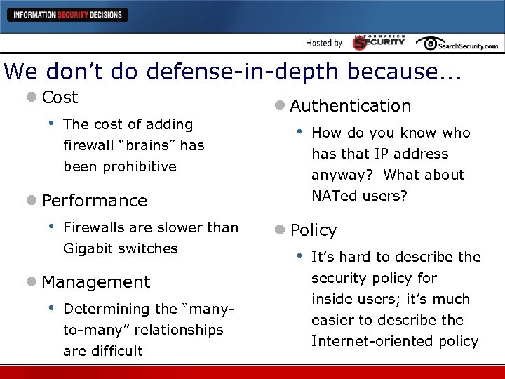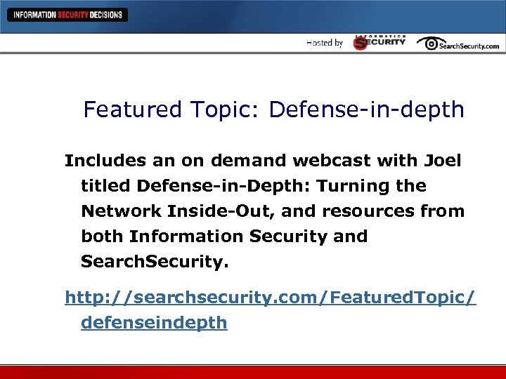Featured Topic: Defense-in-depth Includes an on demand webcast with Joel titled Defense-in-Depth: Turning the Network Inside-Out, and resources from both Information Security and Search. Security. http: //searchsecurity. com/Featured. Topic/ defenseindepth