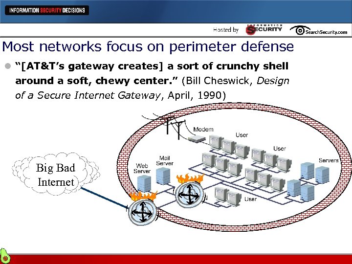 Most networks focus on perimeter defense l “[AT&T’s gateway creates] a sort of crunchy shell around a soft, chewy center. ” (Bill Cheswick, Design of a Secure Internet Gateway, April, 1990) Big Bad Internet