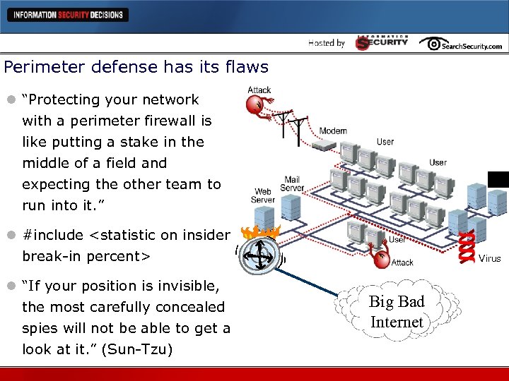 Perimeter defense has its flaws l “Protecting your network with a perimeter firewall is like putting a stake in the middle of a field and expecting the other team to run into it. ” l #include