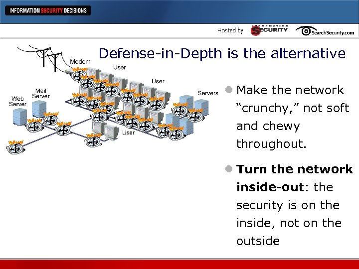 Defense-in-Depth is the alternative l Make the network “crunchy, ” not soft and chewy throughout. l Turn the network inside-out: the security is on the inside, not on the outside