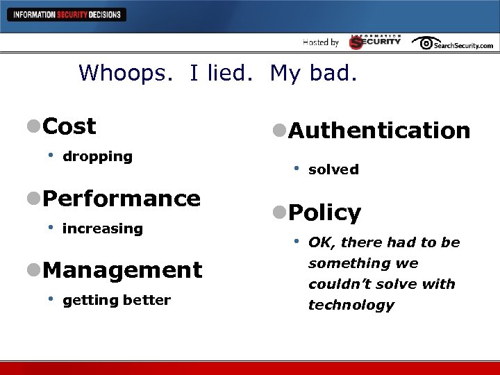 Whoops. I lied. My bad. l. Cost • dropping l. Performance • increasing l. Management • getting better l. Authentication • solved l. Policy • OK, there had to be something we couldn’t solve with technology
