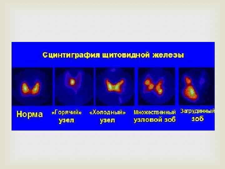 Функциональная автономия щитовидной железы КЛИНИЧЕСКАЯ КАРТИНА: -симптомы тиреотоксикоза: тахикардия, аритмии(фибрилляции предсердий), субфебрилитет, потливость, снижение массы тела, остеопороз. - Отличие от б-ни Грейвса- нет офтальмопатии, чаще развивается именно в пожилом возрасте. ДИАГНОСТИКА: Лабораторная↓ТТГ; Т 4 и /Т 3↑; отсутствие антител к рецептору ТТГ Инструментальная: УЗИ (узловой или многоузловой зоб), Сцинтиграфия с «горячими» узлами.