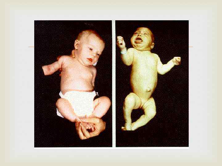КРЕТИНИЗМ (новорожденные дети) *неврологичсеский кретинизм (недостаток йода в первую половину беременности) * Миксематозный кретинизм (нарушение развития собственной железы плода) -Причины: в рассматриваемой теме – дефицит поступления йода в организм плода во время беременности, и относительный гестационный гипотирез матери при наступленнии беременности -Задержка внутриутробного развития, отеки -Брадикардия, затяжная желтуха -Периферический цианоз, отставание в развитии костей , вялое сосание и затрудненное дыхание -Низкий и грубый крик при плаче. Со временем проявляются: олигофрения, глухота, косоглазие, спастическая дисплегия. Гипотиреоз отсутствует, так как поступление йода уже налажено и синтез гормонов восстановлен. ДИАГНОСТИКА: Явная клиническая картина кретинизма Скрининг: ТТГ (более 20 -25 м. МЕ/л, или коэффициент ТТГ/ св. Т 4 (в норме от 0. 27 до 0. 72)