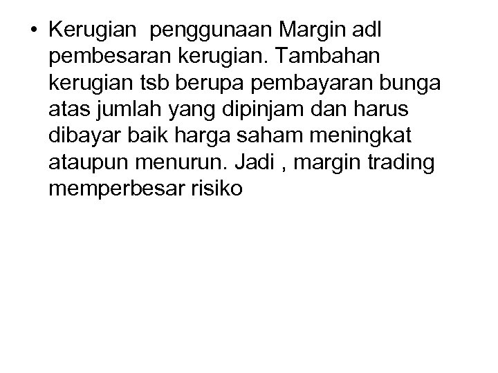 • Kerugian penggunaan Margin adl pembesaran kerugian. Tambahan kerugian tsb berupa pembayaran bunga atas jumlah yang dipinjam dan harus dibayar baik harga saham meningkat ataupun menurun. Jadi , margin trading memperbesar risiko