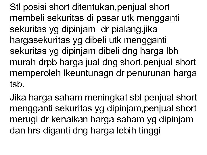 SHORT SELLING • Terjadi jika seseorang menjual kpd pihak lainnya sesuatu yg belum dimilikinya, dng harga pembelian dr item tsb nantinya akan lbh murah pd saat penyerahannya. • Pihak yg menjual scr short biasanya meminjam sekuritas yg akan diserahkan kpd pialang (broker), krn brokerage house banyak memegang saham nasabah mereka.