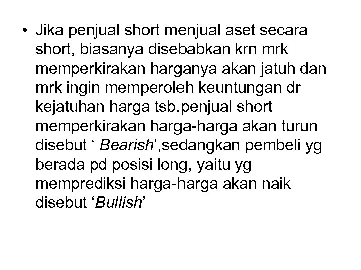 • Jika penjual short menjual aset secara short, biasanya disebabkan krn mrk memperkirakan harganya akan jatuh dan mrk ingin memperoleh keuntungan dr kejatuhan harga tsb. penjual short memperkirakan harga-harga akan turun disebut ‘ Bearish’, sedangkan pembeli yg berada pd posisi long, yaitu yg memprediksi harga-harga akan naik disebut ‘Bullish’