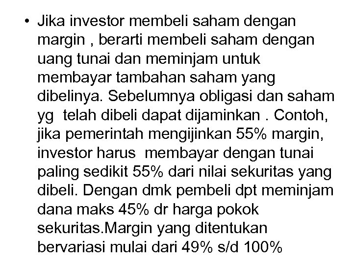 • Jika investor membeli saham dengan margin , berarti membeli saham dengan uang tunai dan meminjam untuk membayar tambahan saham yang dibelinya. Sebelumnya obligasi dan saham yg telah dibeli dapat dijaminkan. Contoh, jika pemerintah mengijinkan 55% margin, investor harus membayar dengan tunai paling sedikit 55% dari nilai sekuritas yang dibeli. Dengan dmk pembeli dpt meminjam dana maks 45% dr harga pokok sekuritas. Margin yang ditentukan bervariasi mulai dari 49% s/d 100%