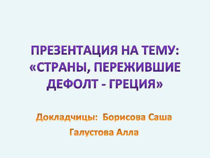 • Дефо лт — невыполнение договора займа, то есть неоплата своевременно процентов или основного долга по долговым обязательствам или по условиям договора о выпуске облигационного займа. • Дефолт может объявляться как компаниями, частными лицами, так и государствами ( «суверенный дефолт» ), неспособными обслуживать все или часть своих обязательств.