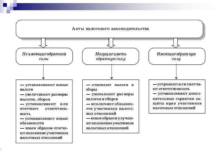 Обратной силы не имеют акты законодательства о налогах и сборах: n n n устанавливающие новые налоги и (или) сборы; повышающие налоговые ставки, размеры сборов; устанавливающие или отягчающие ответственность за нарушение законодательства о налогах и сборах для налогоплательщиков или плательщиков сборов, а также иных участников отношений, регулируемых законодательством о налогах и сборах; устанавливающие новые обязанности налогоплательщиков или плательщиков сборов, а также иных участников отношений, регулируемых законодательством о налогах и сборах; или иным образом ухудшающие положение налогоплательщиков или плательщиков сборов, а также иных участников отношений, регулируемых законодательством о налогах и сборах.