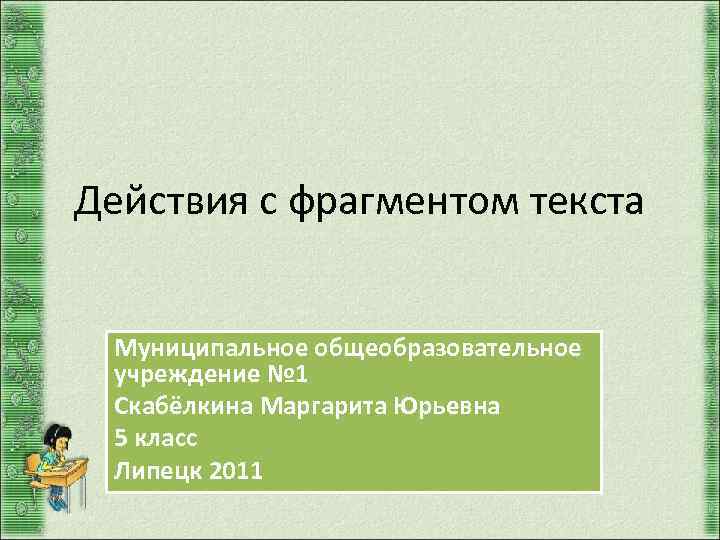 Действия с фрагментом текста Муниципальное общеобразовательное учреждение № 1 Скабёлкина Маргарита Юрьевна 5 класс Липецк 2011