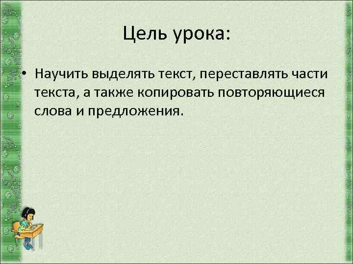 Цель урока: • Научить выделять текст, переставлять части текста, а также копировать повторяющиеся слова и предложения.