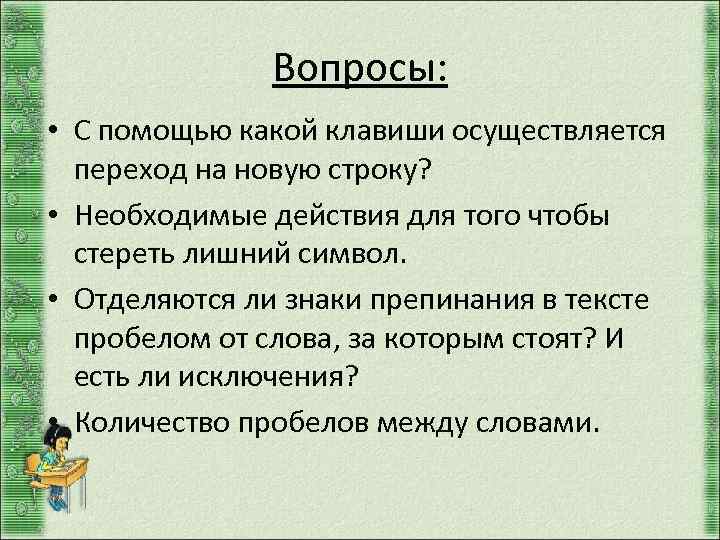 Вопросы: • С помощью какой клавиши осуществляется переход на новую строку? • Необходимые действия для того чтобы стереть лишний символ. • Отделяются ли знаки препинания в тексте пробелом от слова, за которым стоят? И есть ли исключения? • Количество пробелов между словами.