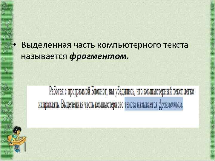 Чтобы выделить текст: • Подведите указатель мыши к началу текста, который надо выделить; • Перемещайте по тексту мышь с нажатой левой кнопкой (фрагмент выделяется полосой темного цвета)