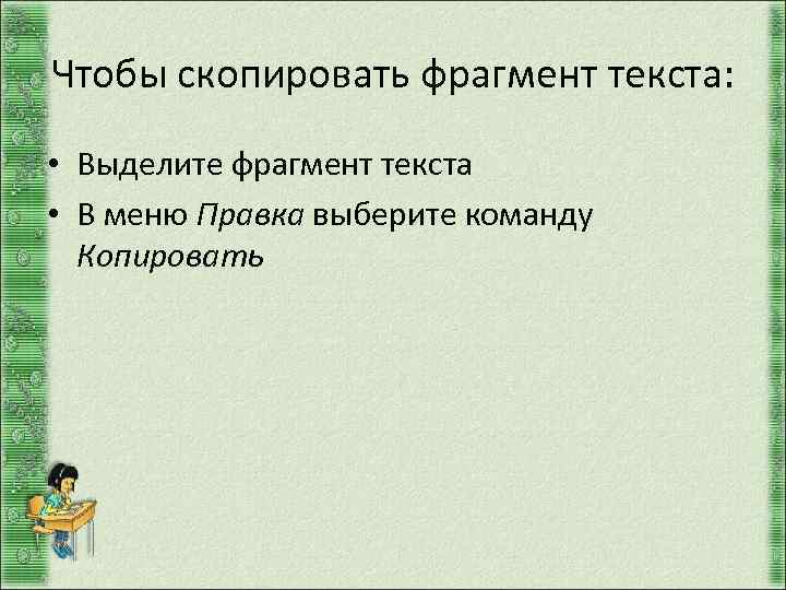 Чтобы скопировать фрагмент текста: • Выделите фрагмент текста • В меню Правка выберите команду Копировать