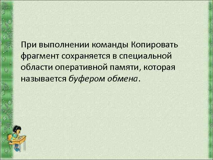 При выполнении команды Копировать фрагмент сохраняется в специальной области оперативной памяти, которая называется буфером обмена.