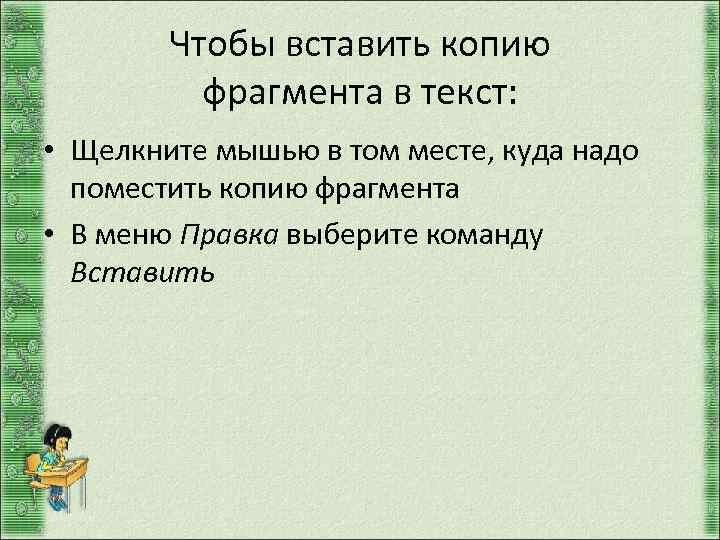 Чтобы вставить копию фрагмента в текст: • Щелкните мышью в том месте, куда надо поместить копию фрагмента • В меню Правка выберите команду Вставить