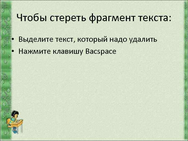 Чтобы стереть фрагмент текста: • Выделите текст, который надо удалить • Нажмите клавишу Bacspace