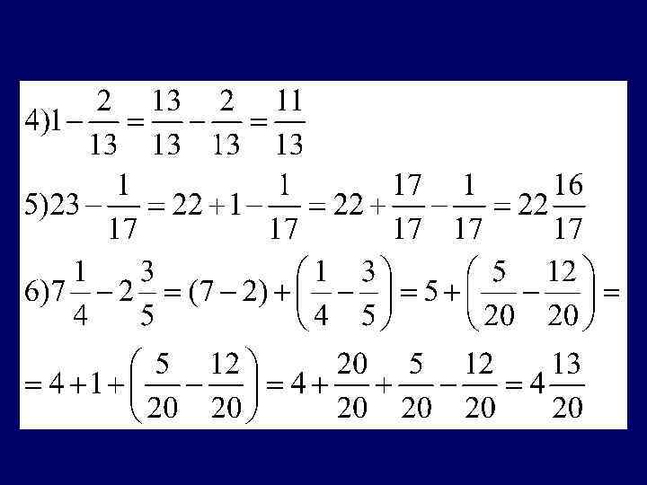 Вычитание смешанных чисел • Алгоритм 1)привести дробные части этих чисел к наименьшему общему знаменателю; если дробная часть уменьшаемого меньше дробной части вычитаемого, превратить ее в неправильную дробь, уменьшив на единицу целую часть уменьшаемого; 2)отдельно выполнить вычитание целых частей и отдельно дробных частей; результаты сложить.