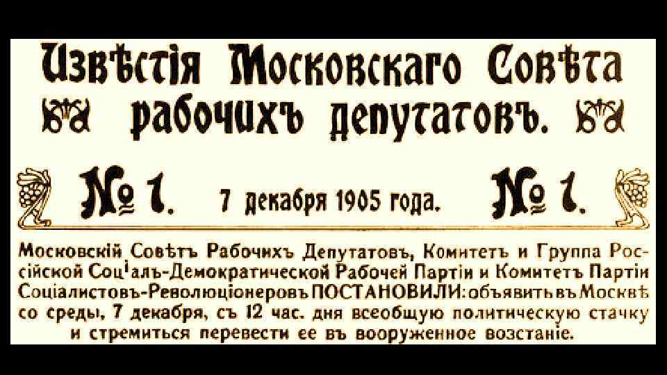 Декабрь 1905 Декабрьское вооруженное восстание в Москве 15. 5. -19. 7. 1905 Первый рабочий совет (Иваново-Вознесенск) Июнь-июль 1905 Восстание на броненосце «Потемкин» (порт приписки Одесса) янв 1905 6. 8. 1905 «Булыгинская дума» (манифест 6 августа) Кровавое воскресенье Октябрьская политическая стачка. Взрыв дачи Столыпина на Аптекарском о-ве (Спб, эсерымаксималисты) Деятельность рабочего совета в Петербурге (Троцкий, Хрусталев-Носарь) Авг. 1906 -апр. 1907 Военно-полевые суды Первая русская революция (9. 1. 1905 -3. 6. 1907) фев мар апр май июн июл авг 9. 1. 1905 Октябрь 1905 12. 8. 1906 сен окт ноя дек 17. 10. 1905 Манифест 17 октября (Манифест «об усовершенствовани и государственного порядка» ) 27. 8. 1905 Восстановление автономии университетов янв фев мар апр май июн июл авг 1906 сен окт ноя Апрельиюль 1906 I Госдума 8 -10. 7. 1906 дек 9. 11. 1906 Начало аграрной реформы Столыпина Отставка Горемыкина, назначение Столыпина, роспуск I Госдумы, «Выборгское воззвание» янв фев мар апр май июн июл 1907 Февраль-июнь 1907 II Госдума 3. 6. 1907 Манифест 3 июня. Роспуск II ГД. Избирательная реформа.