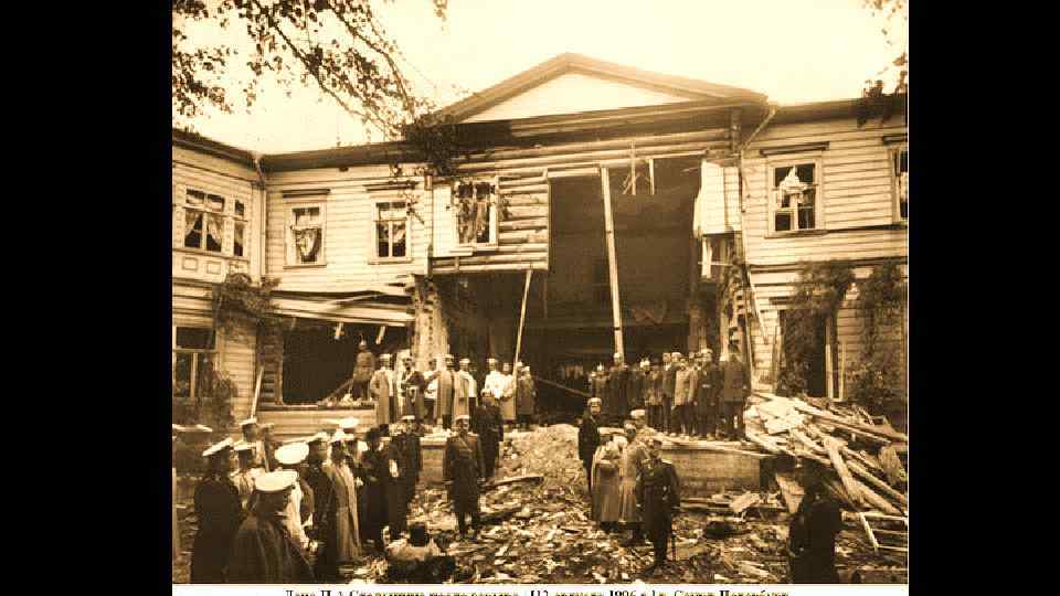 Дача Столыпина Аптекарский остров Зимний дворец Таврический дворец Совет рабочих депутатов в Петербурге (до января 1906) Путиловский завод Вид на фасад дачи Столыпина после взрыва