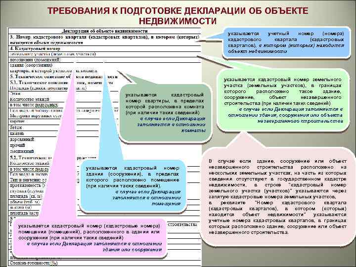 ТРЕБОВАНИЯ К ПОДГОТОВКЕ ДЕКЛАРАЦИИ ОБ ОБЪЕКТЕ НЕДВИЖИМОСТИ указывается учетный номер (номера) кадастрового квартала (кадастровых кварталов), в котором (которых) находится объект недвижимости указывается кадастровый номер квартиры, в пределах которой расположена комната (при наличии таких сведений) в случае если Декларация заполняется в отношении комнаты указывается кадастровый номер здания (сооружения), в пределах которого расположено помещение (при наличии таких сведений). в случае если Декларация заполняется в отношении помещения указывается кадастровый номер (кадастровые номера) помещения (помещений), расположенного в здании или сооружении (при наличии таких сведений) в случае если Декларация заполняется в отношении здания или сооружения указывается кадастровый номер земельного участка (земельных участков), в границах которого расположено такое здание, сооружение, объект незавершенного строительства (при наличии таких сведений) в случае если Декларация заполняется в отношении здания, сооружения или объекта незавершенного строительства В случае если здание, сооружение или объект незавершенного строительства расположено на нескольких земельных участках, на часть из которых сведения отсутствуют в государственном кадастре недвижимости, в строке "кадастровый номер земельного участка (участков)" указываются через запятую кадастровые номера земельных участков, в реквизите "Номер кадастрового квартала (кадастровых кварталов), в котором (которых) находится объект недвижимости" указываются учетные номера кадастровых кварталов, в границах которых расположено здание, сооружение или объект незавершенного строительства.