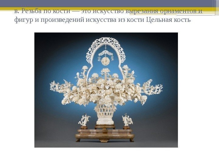 в. Резьба по кости — это искусство вырезания орнаментов и фигур и произведений искусства из кости Цельная кость
