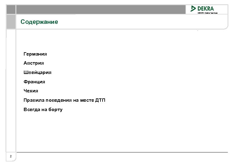 DEKRA Claims Services Содержание Германия Австрия Швейцария Франция Чехия Правила поведения на месте ДТП Всегда на борту 2