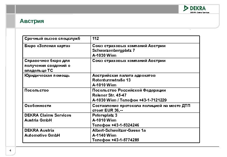 DEKRA Claims Services Австрия Срочный вызов спецслужб 112 Бюро «Зеленая карта» Союз страховых компаний Австрии Schwarzenbergplatz 7 A-1030 Wien Союз страховых компаний Австрии Справочное бюро для получения сведений о владельце ТС Юридическая помощь Посольство Особенности DEKRA Claims Services Austria Gmb. H DEKRA Austria Automotive Gmb. H 4 Австрийская палата адвокатов Rotenturmstraße 13 A-1010 Wien Посольство Российской Федерации Reisner Str. 45 -47 A-1030 Wien / Телефон +43 -1 -7121229 Составление протокола полицией на месте ДТП стоит EUR 36, -Petersplatz 3 A-1010 Wien Телефон +43 -1 -5324246 Albert-Schweitzer-Gasse 1 a A-1140 Wien Телефон +43 -1 -5774285
