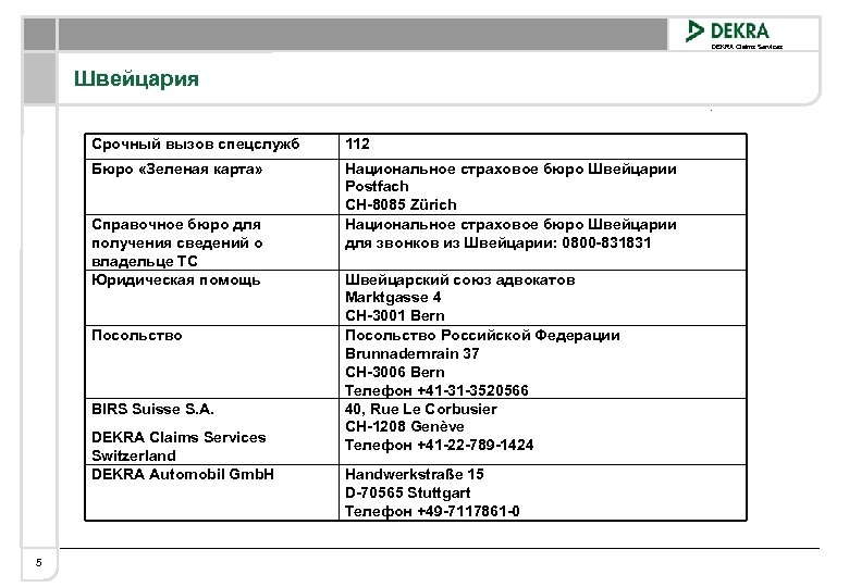DEKRA Claims Services Швейцария Срочный вызов спецслужб 112 Бюро «Зеленая карта» Национальное страховое бюро Швейцарии Postfach CH-8085 Zürich Национальное страховое бюро Швейцарии для звонков из Швейцарии: 0800 -831831 Справочное бюро для получения сведений о владельце ТС Юридическая помощь Посольство BIRS Suisse S. A. DEKRA Claims Services Switzerland DEKRA Automobil Gmb. H 5 Швейцарский союз адвокатов Marktgasse 4 CH-3001 Bern Посольство Российской Федерации Brunnadernrain 37 CH-3006 Bern Телефон +41 -31 -3520566 40, Rue Le Corbusier CH-1208 Genève Телефон +41 -22 -789 -1424 Handwerkstraße 15 D-70565 Stuttgart Телефон +49 -7117861 -0