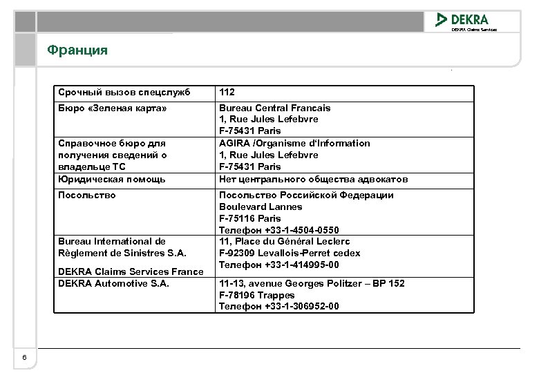 DEKRA Claims Services Франция Срочный вызов спецслужб 112 Бюро «Зеленая карта» Bureau Central Francais 1, Rue Jules Lefebvre F-75431 Paris AGIRA /Organisme d‘Information 1, Rue Jules Lefebvre F-75431 Paris Нет центрального общества адвокатов Справочное бюро для получения сведений о владельце ТС Юридическая помощь Посольство Bureau International de Règlement de Sinistres S. A. DEKRA Claims Services France DEKRA Automotive S. A. 6 Посольство Российской Федерации Boulevard Lannes F-75116 Paris Телефон +33 -1 -4504 -0550 11, Place du Général Leclerc F-92309 Levallois-Perret cedex Телефон +33 -1 -414995 -00 11 -13, avenue Georges Politzer – BP 152 F-78196 Trappes Телефон +33 -1 -306952 -00
